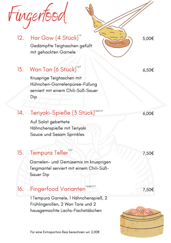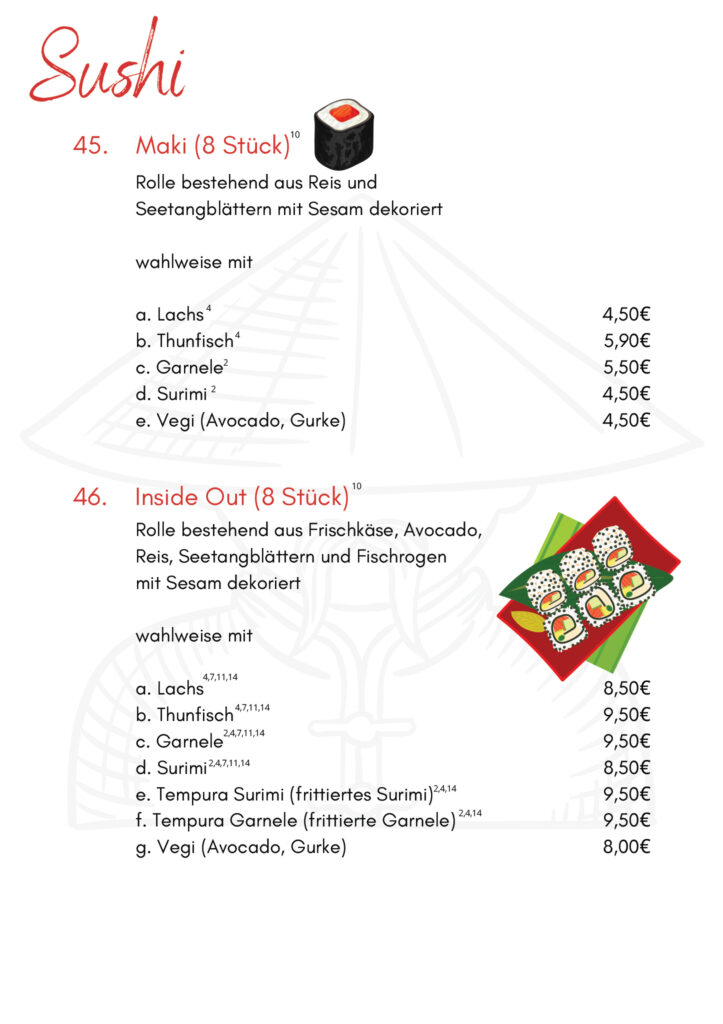 Das Menü suppen & Salate Fingerfood Curry Gerichte Wok Gerichte nuddelgerichte Vietnamesische nuddelgerichte Poke Bowls & Kinderteller Sushi externe Insides out rolls Bentos sushi platten Dessert & Getränke Hinweis allergien